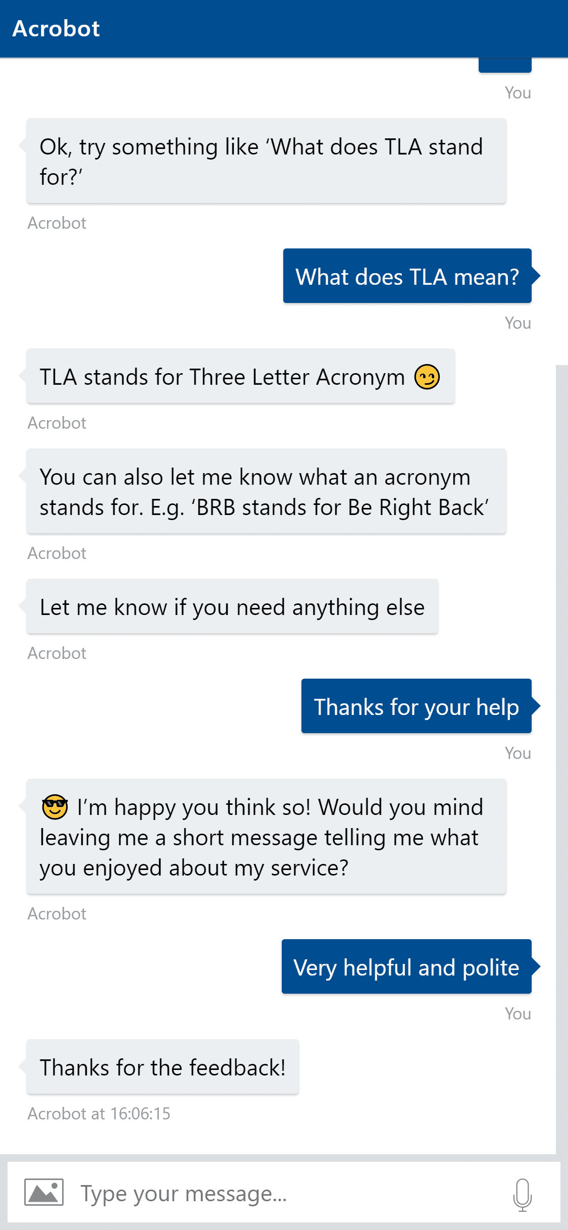 As I was leaving the talk a friend suggested a great use case for a bot ‐ acronyms. Often the curse of most people’s work lives where you’re expected to know what they mean and are thrown about with abandon by people trying to sound intelligent. Well, no more!
