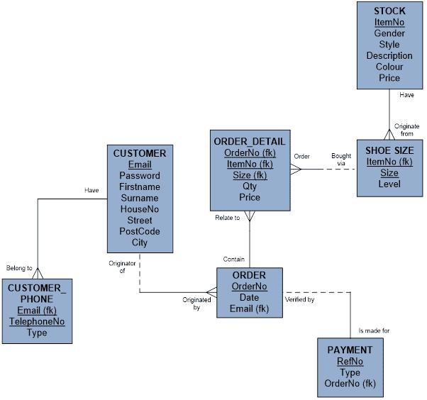 The first step was to identify the entities, relationships and attributes by analysing the project brief. The entities are the things of significance about which information needs to be known, such as shoes, customers and orders. Relationships explain how the entities are related (one to one, one to many), and the attributes contain specific information about the entities, such as shoe types, gender and payment method. The result of this is a conceptual entity relationship diagram, which is a first attempt at modelling the database.