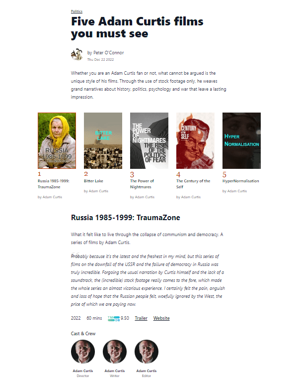 For documentary information I integrated with a 3rd party API provided by The Movie Database. This enabled me to store just the id of a documentary in my database, and reach out to the 3rd party API to fetch extra details for the UI.