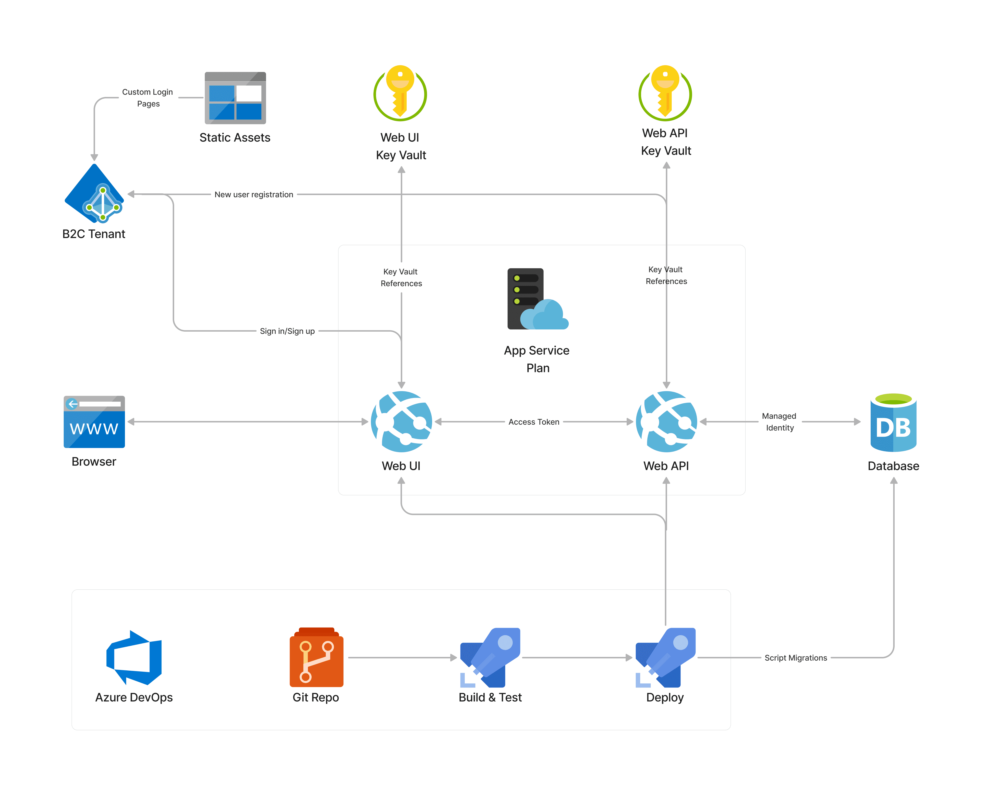 Architecturally, the app is relatively straightforward. We have two App Services under a single App Service Plan, one for the UI and another for the API. The API connects to an Azure SQL database using managed identity as mentioned. Each App Service has its own Key Vault which surfaces app settings via Key Vault References. The B2C tenant handles authentication, returning an ID token and an access token for the API once authenticated. When a new user registers, a B2C API connector is used to call the API app so the new user can be inserted into the database. A storage account is used for the B2C static assets e.g. custom branding, login page etc.
