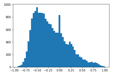 Plotting a sentiment histogram confirms the hypothesis that the majority of news is negative. There is a second peak at zero which, although it is a valid value (indicating a more neutral sentiment), it was checked to make sure this wasn’t as a result of the sentiment analysis returning a null value for whatever reason. The other variables all had valid values when sentiment is equal to zero so this was considered to be OK.