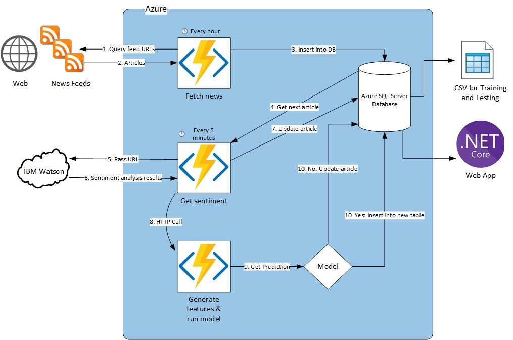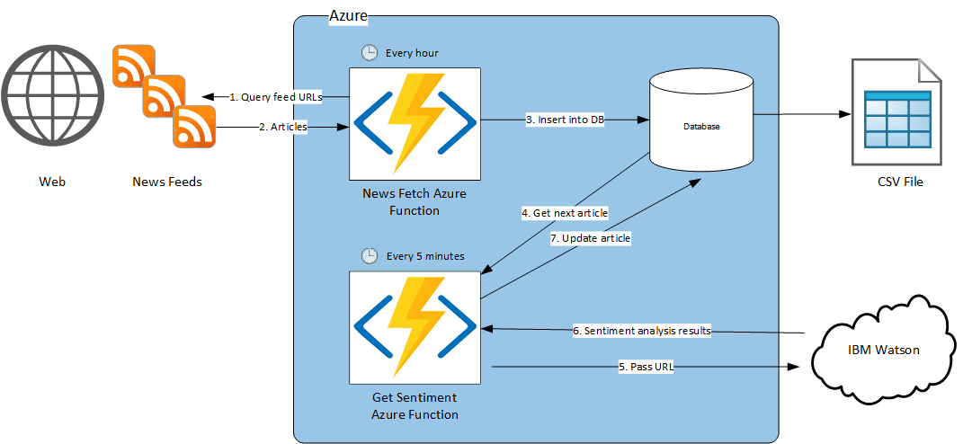An automated data pipeline was created using the Microsoft Azure cloud. The use of Azure Functions means that scripts can be set to run on a timer. The retrieval of news articles from the RSS feeds and retrieval of sentiment scores can be separated into their own Azure Functions and set to run at a specific time interval. A news fetch function runs once every hour and inserts new stories into a database. A sentiment analysis function then runs every five minutes, gets the next row in the database without a sentiment score, passes this to the Natural Language Understanding API and updates the database with the results. This automated pipeline means we can accumulate a large dataset with little or no extra work apart from the initial setup.