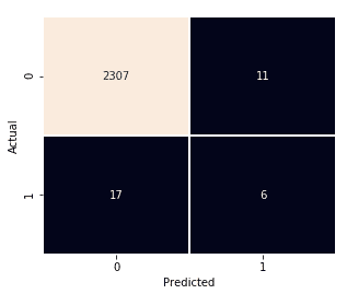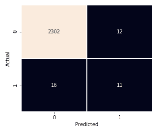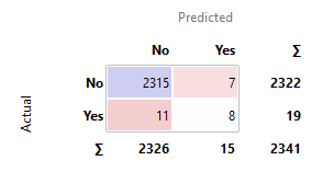 - Accuracy: (TP + TN) / Total = (16 + 2302) / 2341 = 0.99