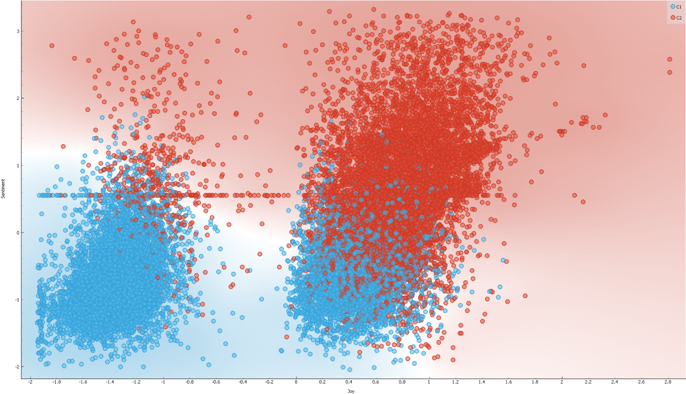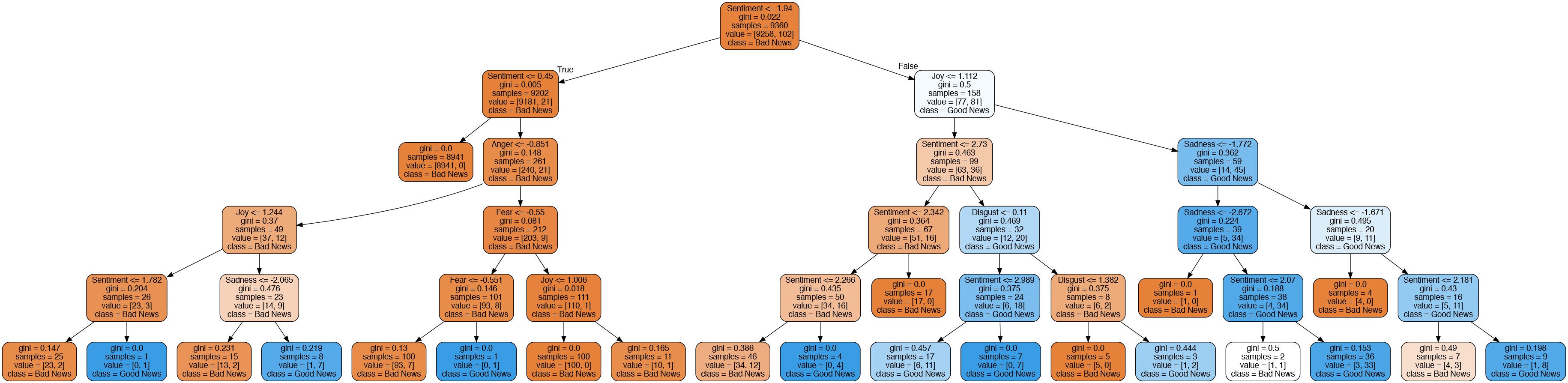 A good first run is to limit the depth of the tree. This will give us a feel as to how the decisions are being inferred. We can see that sentiment is the main driver of the tree as it used as the parent node. Joy and anger are the other emotions considered: