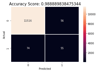 - Accuracy: (TP + TN) / Total = (55 + 11516) / 11701 = 0.99