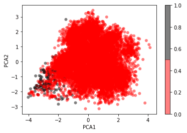 Before a model was created, I wondered if that now we have a labelled dataset, would any clusters emerge from our PCA analysis carried out previously? Note the analysis is exactly the same, PCA is an unsupervised process, so it doesn’t use any labels, this was just for a visualisation aid: