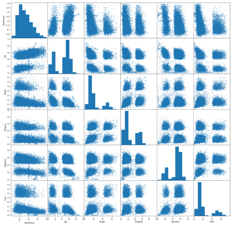 The next stage was to investigate the relationship between variable’s relationships. A scatter plot matrix is a good plot to get an overall idea of this. What is striking about this plot is the groupings. It seems we have very distinct groupings of emotions, which seem to come in four different groups. Sentiment is different, we see two distinct groups. The histograms of the emotion variables (joy, anger, disgust, sadness and fear) show that emotions tend to be at one extreme or the other, with not a lot in between, hence the two distinct groupings. As sentiment becomes more positive, the negative emotions like fear, sadness, disgust and anger reduce, but the opposite happens for joy, which as a positive emotion, makes sense. The emotion histograms however seem to be telling us that our initial hypothesis about news being negative and fear mongering isn’t perhaps quite the case. Fear, disgust and anger are skewed towards zero, and joy is skewed in the other direction. Sadness is the only emotion that seems to back up our hypothesis. The conclusion at this stage seems to be that although the overall sentiment of the majority of news is negative, the journalists weave a narrative, conveying the full gamut of human emotions.