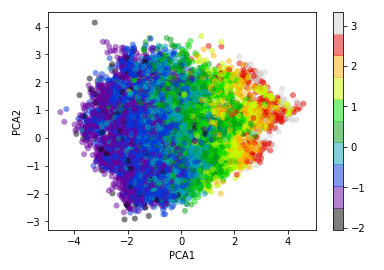 Could the dataset be simplified to find more defined clusters? We have six variables in our dataset which could potentially be simplified by deriving a smaller set of variables that still explain the total variance in the dataset, but remove noise and correlated variables that are redundant. Principal Component Analysis (PCA) is one technique that can be used to do this. The image below shows the initial principal component analysis using two principal components. There doesn’t appear to be a clear boundary between clusters emerging.