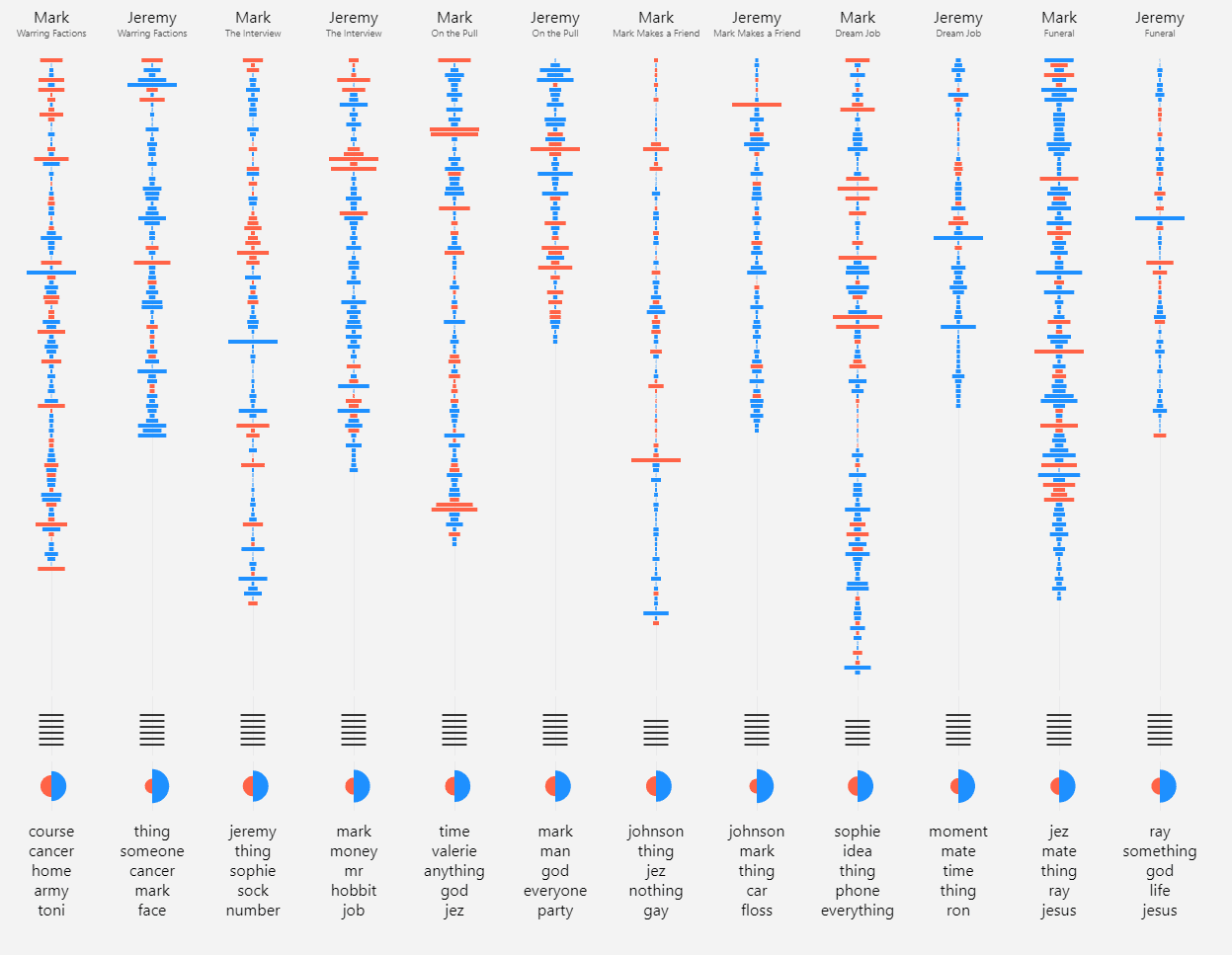 I was pleased with how this chart came out as it reveals some interesting pieces of the data at a finer “episodic” level of granularity. It shows the proportions of internal vs external lines, particularly how each character compares with the other. The average word length shows that Mark probably does have the better vocabulary. The bars really emphasise any outliers (lines with lots of words) which makes for interesting secondary analysis. I combined most of these with audio snippets as they were often the most amusing lines in the show. Finally, the top nouns reflect the general theme of the episode from that character's point of view.