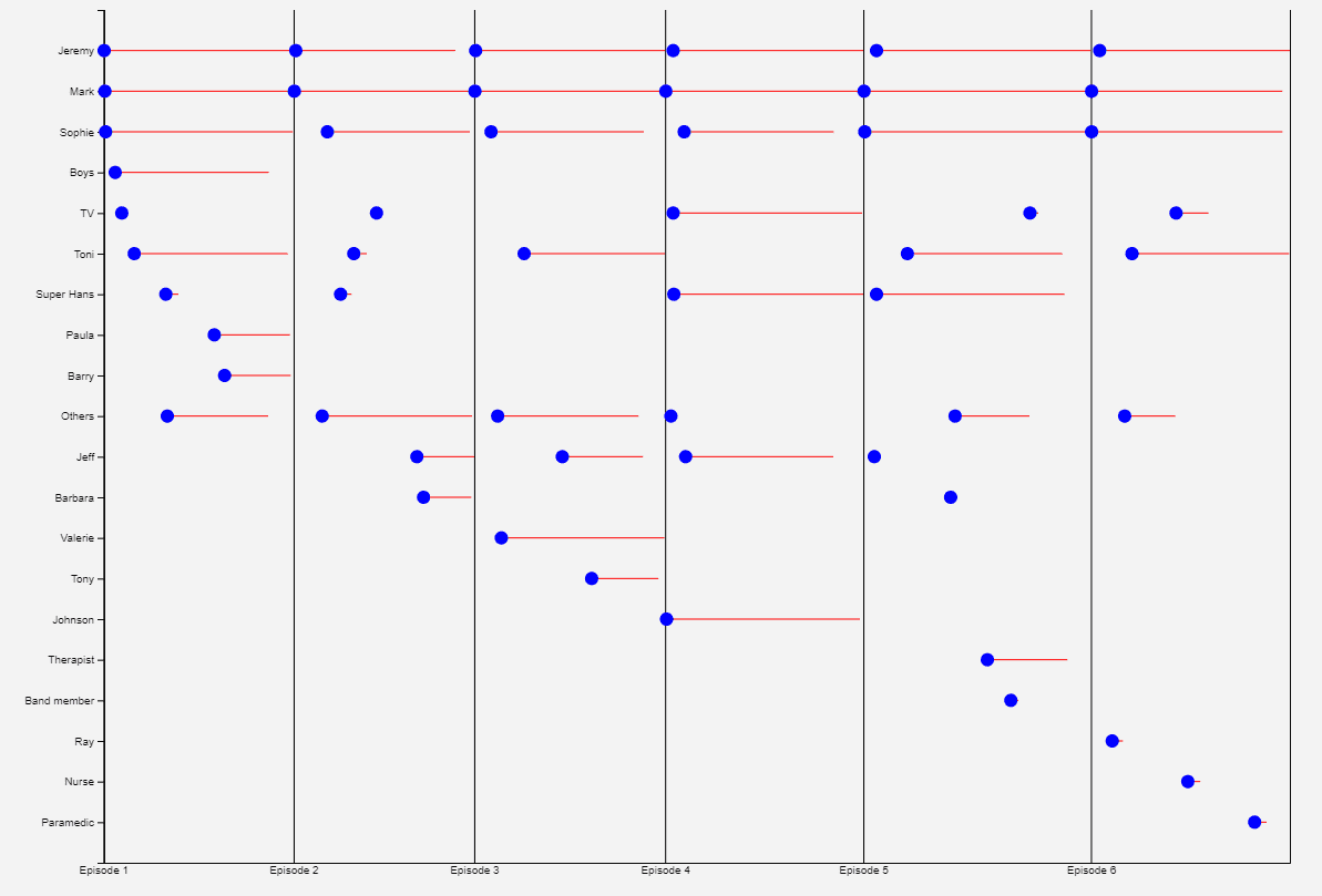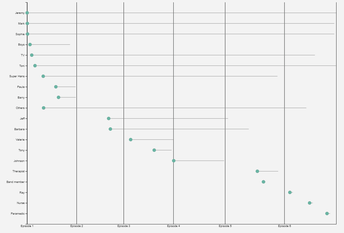 I had included a simple timeline visualisation which shows where characters appear and for how long. Again, I wasn't convinced this portrayed enough detail, plus finding out which characters appeared in which episodes could be deduced from some of the other visuals. The plan is to somehow modify this to visualise character's development over the entire show.