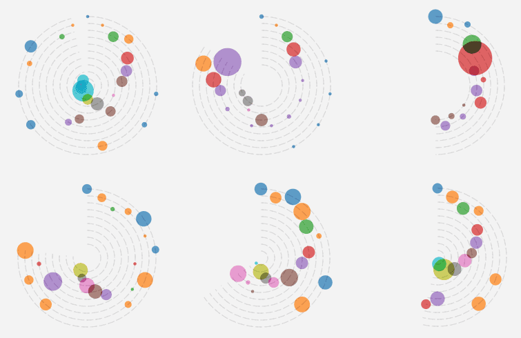 I still haven't found a satisfactory way of visualising the location part of the data, which shows where abouts the line was said. I thought it could be interesting to see how many lines were based inside the flat (the flat is almost a character in itself) compared to outside. My first idea was to use a kind of radial bubble chart where each bubble was a location sized by the number of lines. You could then visualise how each episode progressed by reading around the circumference. Unfortunately, I didn't think this portrayed anything particularly interesting about the data. Larger bubbles from long scenes based at the same location clouded the chart too, making it hard to extract anything useful. Back to the drawing board on this.