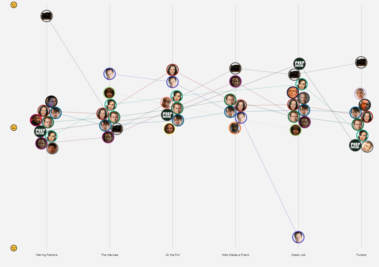 With such a mass of bubbles, techniques such as tooltips and filtering were utilised to aid users with their exploration. Also, as the data clusters around the neutral mark spotting an overall sentiment trend was difficult. Therefore, I thought it would be worth grouping the bubbles per character and calculating an average sentiment score. Instead of bubbles, avatars made more sense here as we are at the character level and I decided to connect them with lines so you can get a sense of the series trend that was hidden in the mass.