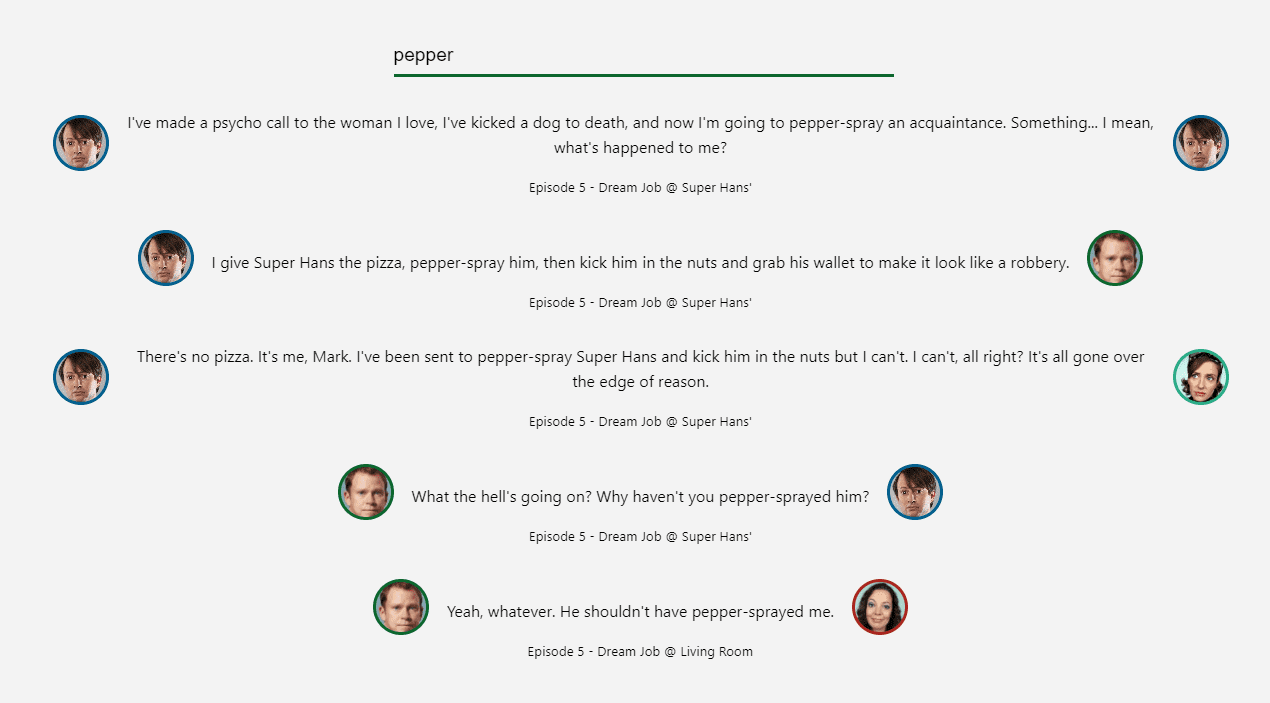 This just leaves a word search feature for now. Whilst not quite data visualisation, I think it provides a nice way for users to explore the data by looking for key words or phrases. Plus, some of the lines are hilarious when taken out of context.